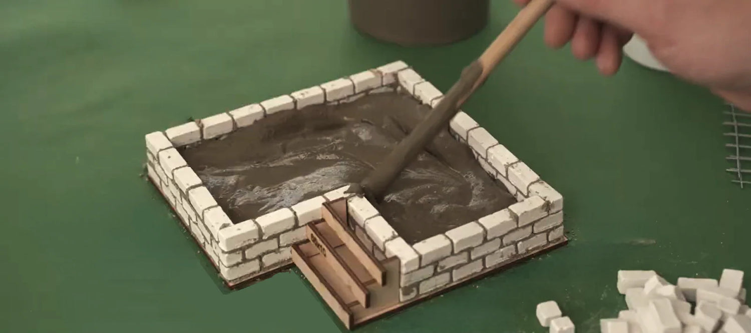 - Take the modeling spatula and apply concrete mortar to the bottom and one smaller side of the brick so that you can easily connect the next brick.